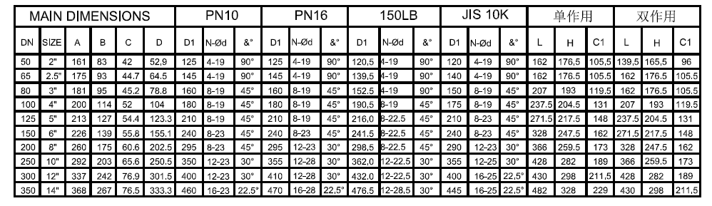 氣動U型蝶閥尺寸表: